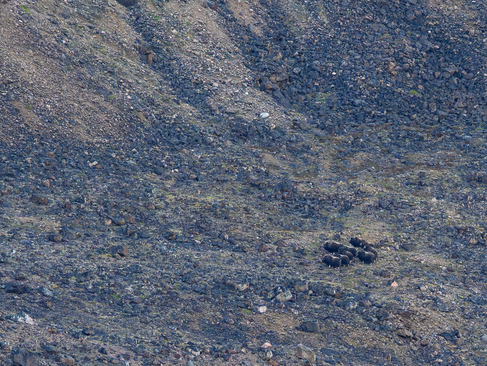 Today no one lives in Foulke Fjord except millions of Little Auks. They nest on the cliffs of the 610 m/2000 ft mountains defining the fjord. As a result of their presence, there is quite a bit of actual green. They are easily spooked by the zodiacs from the ship. Another result is that grazing animals like Musk Ox have something to graze. From the ship I spotted 9 musk ox who are clustered in a defensive position because hikers from the ship were on the ridge above them.