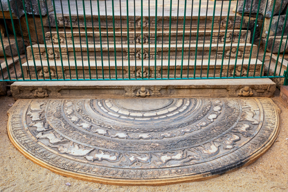 Sri Lankan Buddhist temple entrances always have a carved granite moonstone (a Sri Lankan art form), guard stones (usually male with a naga (a 7-headed cobra behind the guard's figure) installed on either side of the moonstone, and balustrades (railings) often carved in the shape of a dragon. The moonstone's rings show how a life should progress from worldly to enlightenment to achieve nirvana (the smallest ring). This moonstone is dated to the 7th - 8th century AD.