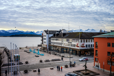 Molde has been a city since 1742 but because of its history of unfortunate town fires followed by German bombings in 1940, most buildings are post-war, mid-century architecture. The city of Molde gradually rises up from the waterfront allowing spectacular views of the 222 partially snow-capped mountain peaks from every elevation. Ferries are so frequent that they pass each other on the way in or out of Molde's ferry harbor.