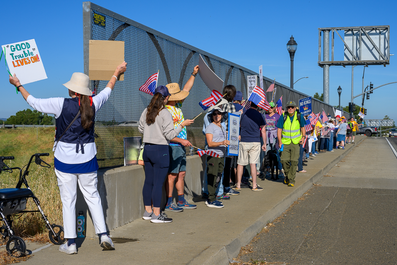 Dan and I held our No Kings 3 protest signs up at the Missouri Flat Overpass over US Highway 50. It is a particularly wide stretch of road with 2 lanes in each direction plus turn lanes on either side of the overpass. Standing on the sidewalk we are quite exposed but we are a hardy group.