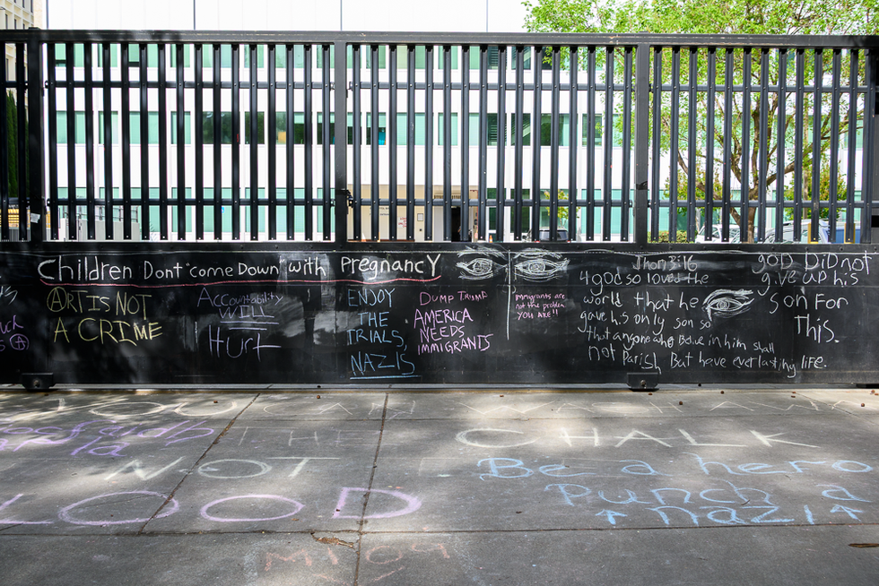 An ongoing vigil is being held at the John Moss Federal Building (650 Capitol Mall) which is the location of the federal immigration courts. The vigil is mostly behind the federal building on N Street. There were a lot of people there, it was like a party, but it was the chalk art at the parking lot gate to the building that grabbed my attention. The John 3:16 verse with the addendum of "God did not give up his son for this" was perfect.