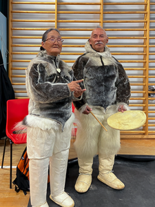 The handsome couple is wearing clothing created by the woman. She is wearing a seal fur jacket (the seal's tail is left on), polar bear leggings, and thigh-high sealskin boots. His ensemble is much the same except that his boots are just knee high and his polar bear pants are visible above. He played the qilaat (the sealskin covered round drum) and they both sang. They have been married 40+ years.