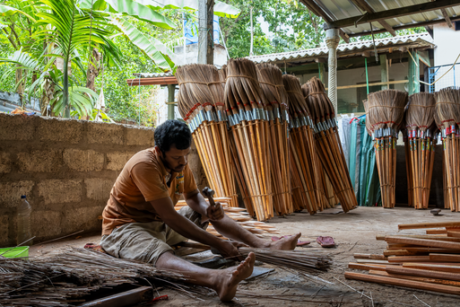 We stopped at a one-man broom making factory. Coconut palm fronds are dried and separated into fibers (coir) that are then bundled and used for broom bristles. Two types of brooms are made: one is for interiors and the other (similar to a rake) for outside sweeping. The brooms are transported to local hardware shops where they sell for about $2 each. With constant use, a broom lasts about 2 months. The broomsticks are Sri Lankan mahogany.